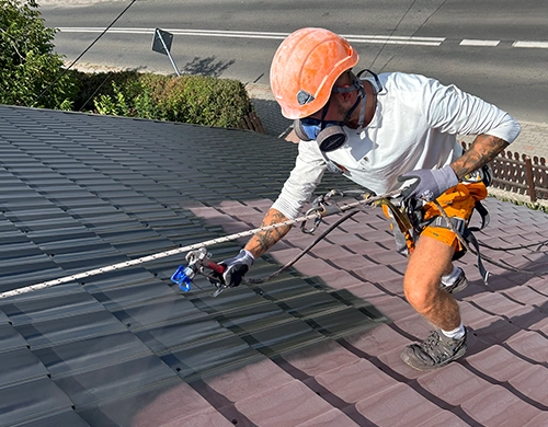 Dachówka ceramiczna, betonowa, blacha, blachodachówka – malujemy natryskowo. Pracujemy na wysokościach metodami alpinistycznymi.
